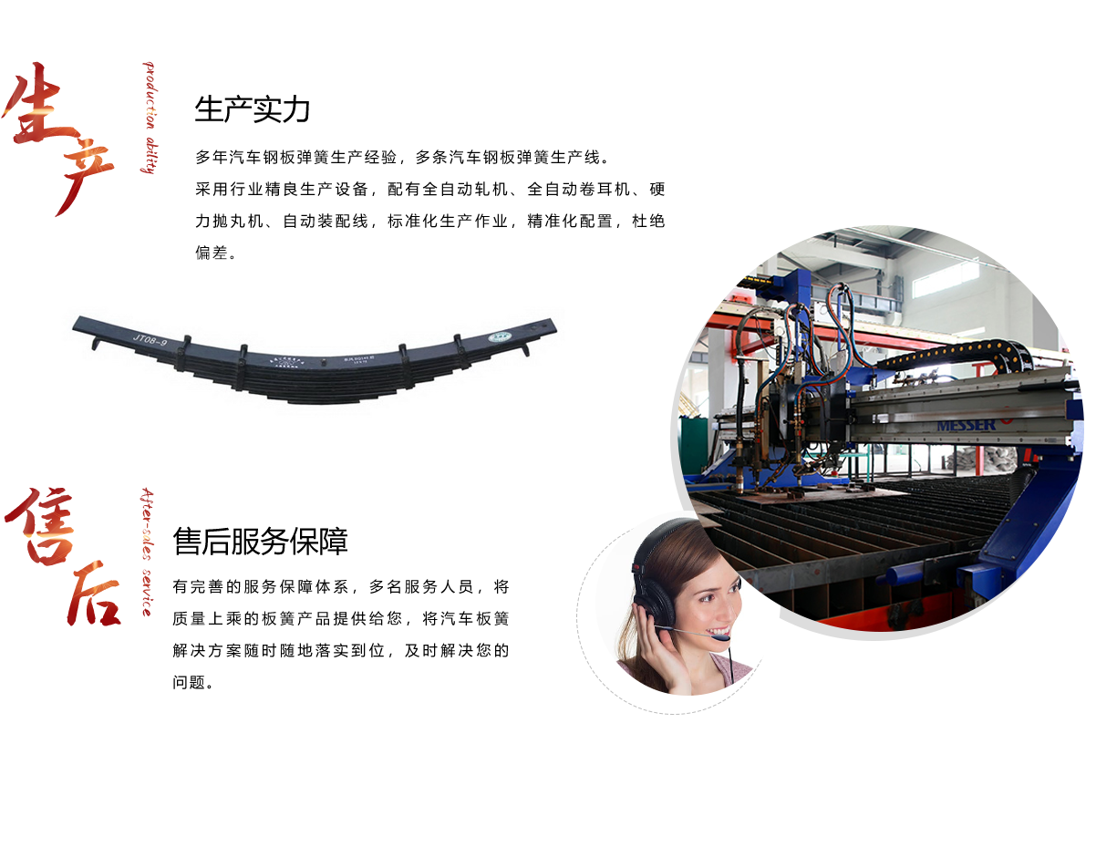 我們以其奇特的生產工藝在同行業中獨樹一幟,其產品一直供不應求,深受顧客青睞。公司主要生產銷售汽車鋼板彈簧東風汽車板簧等。我們的企業精神:科技興業、質量為本、追求卓越、誠實守信;以顧客為關注焦點、保護環境、造福社會是企業努力的方向;全公司將用:一如既往、開拓新穎的企業精神……